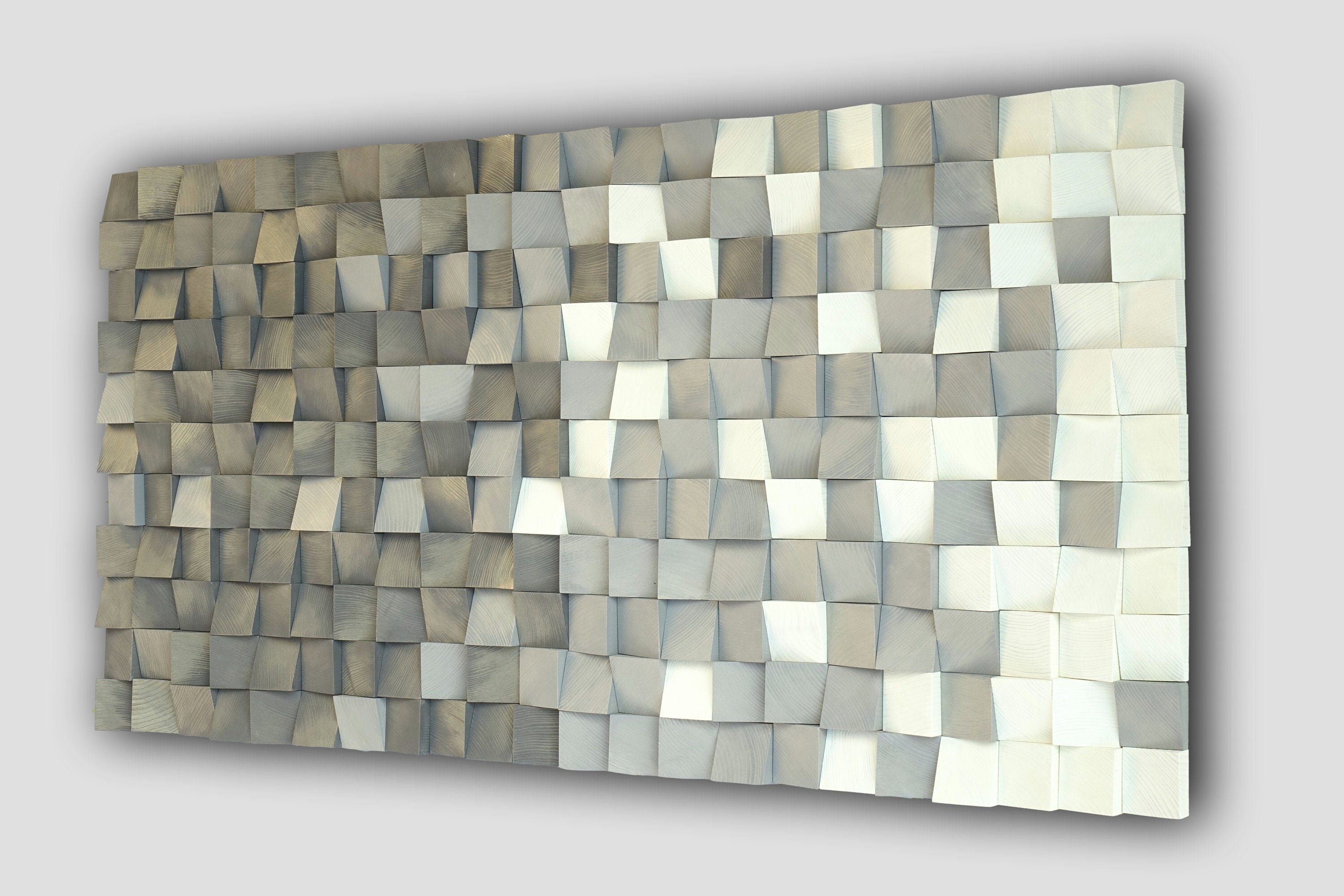 An appealing to look at contemporary gray - bronze, gold and white 3D wood wall art. This piece, hand made out of shaped wooden blocks cut onto tringles, will spruce up your living area's walls and create a decorative and relaxing atmosphere inside your home.