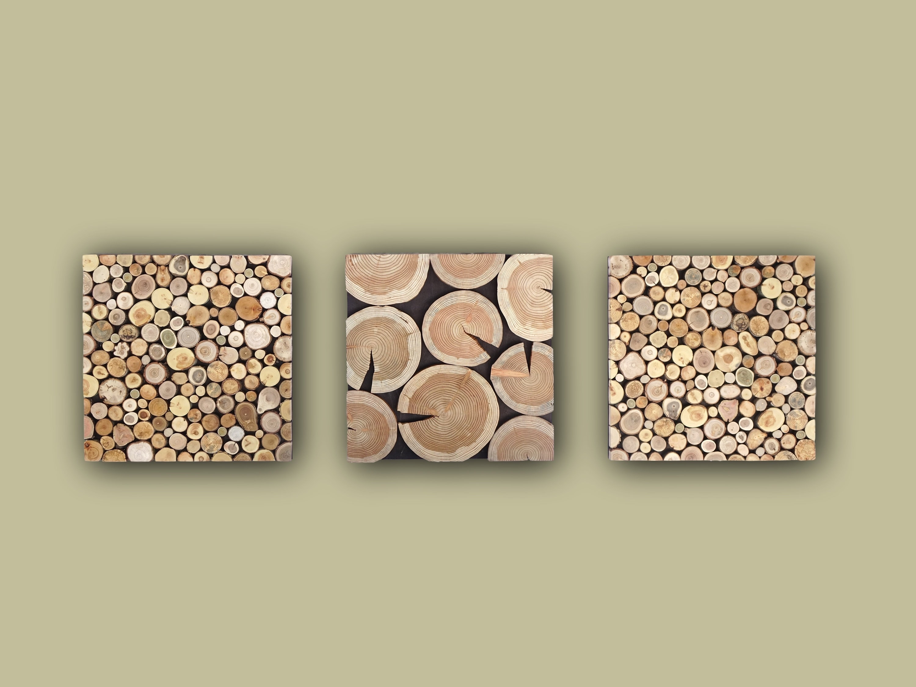 The whole process of making this unique wooden wall triptych takes plenty of time. Starting from claiming the pieces of wood from the forest to the final finishing, each piece passes through our hands several times. Each, even the smallest, piece is treated individually with due care and attention to fully bring out its natural beauty and to not interfere with its natural character. We start from claiming the tree branches from forests and orchards, then we air dry them for a period of 3 to 12 months. Afterwards we kiln dry the wood to eliminate insects that lives inside. Then the branches are cleaned, precisely cross cut, smoothed and sanded. Only now is the time to create an artwork - laying down the mosaic of slices. To prevent slices form cracking and color changing, at the very end each piece is impregnated with an organic oil. Although this process is a lot of fun, a lot of hard work is also done. But the effects are truly rewarding…