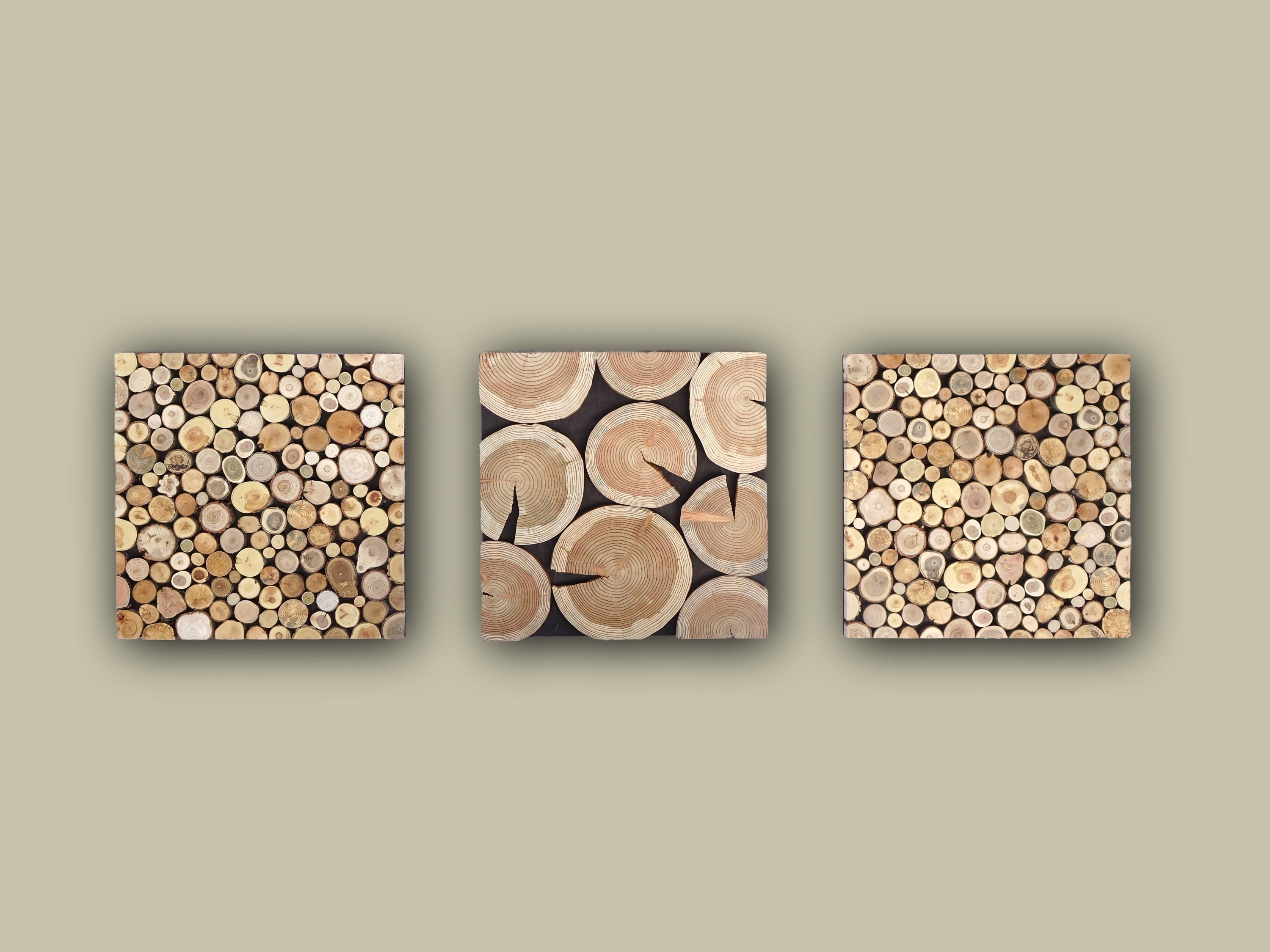 The shown set is a previously ordered and sold one. The pictured panels was 51”x51” (130x130cm). The listing is for a set of 3 pieces 23"x30" (59x75cm) each panel or 25"x25" (65x65cm) pieces. We will custom make similar panels of this design. We can customize the dimensions, color (natural or warm hue), shape and even used spices of tree. Each set will be absolutely unique and never exactly the same as shown on pictures.