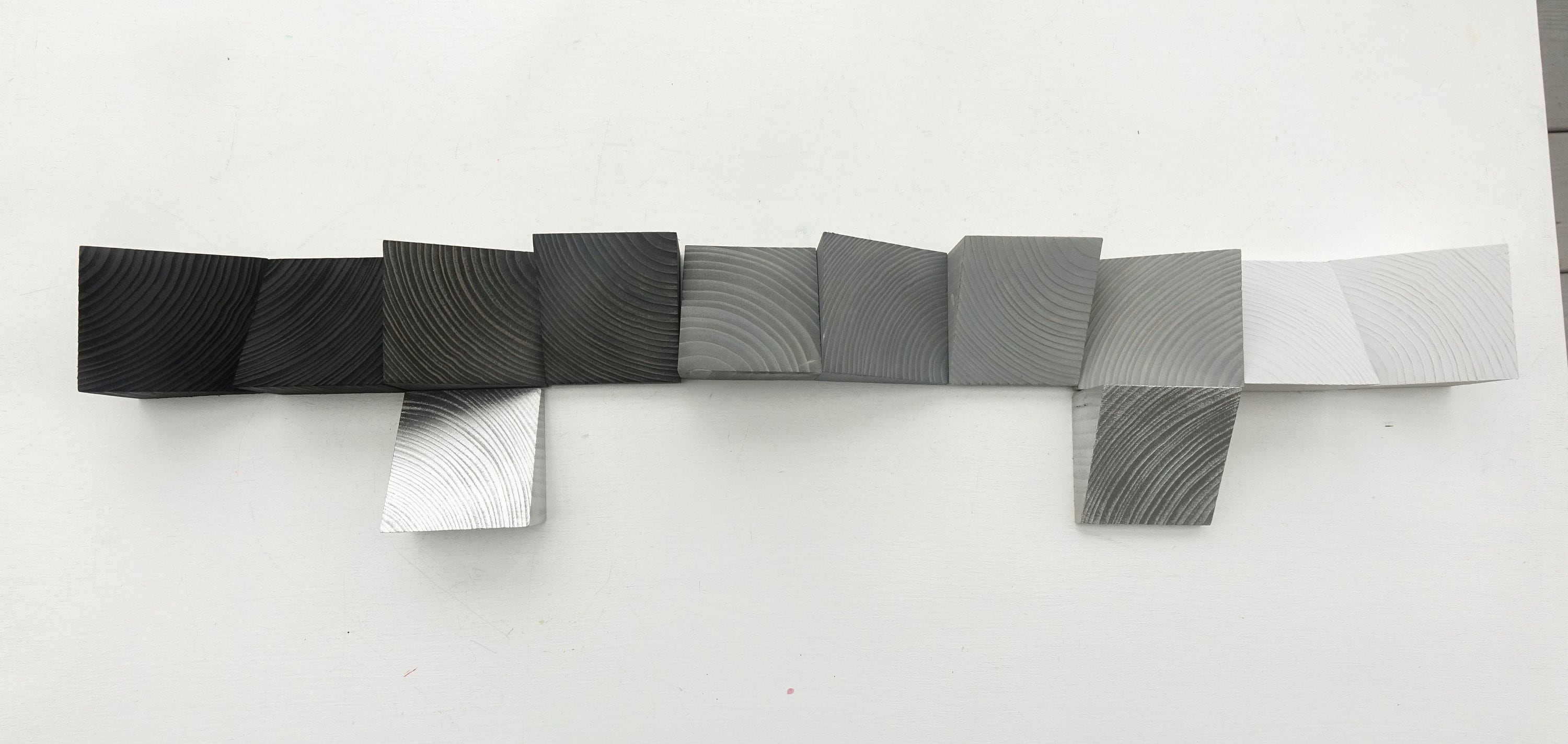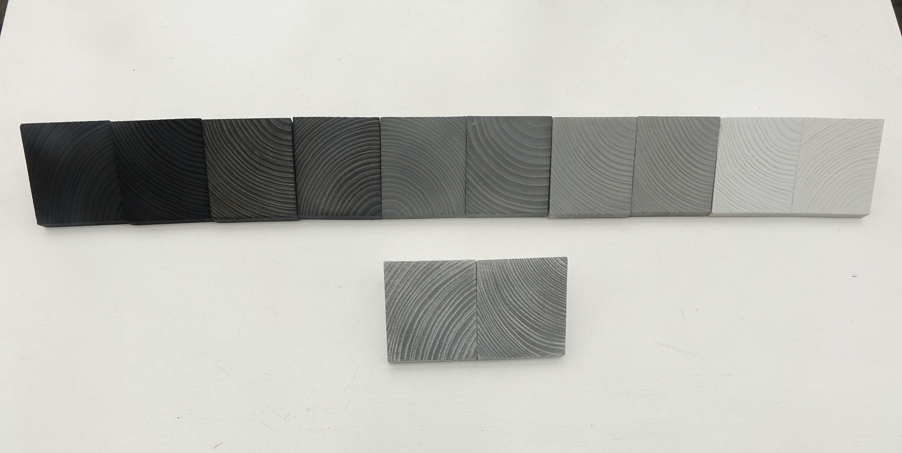 The color gradient begins with a dark hue (anthracite/almost black) and gradually transitioning through lighter shades of warm gray to white as on images of the sample blocks. Both the photos contain the same colors - different shots taken from different angles, and with different the lighting.