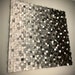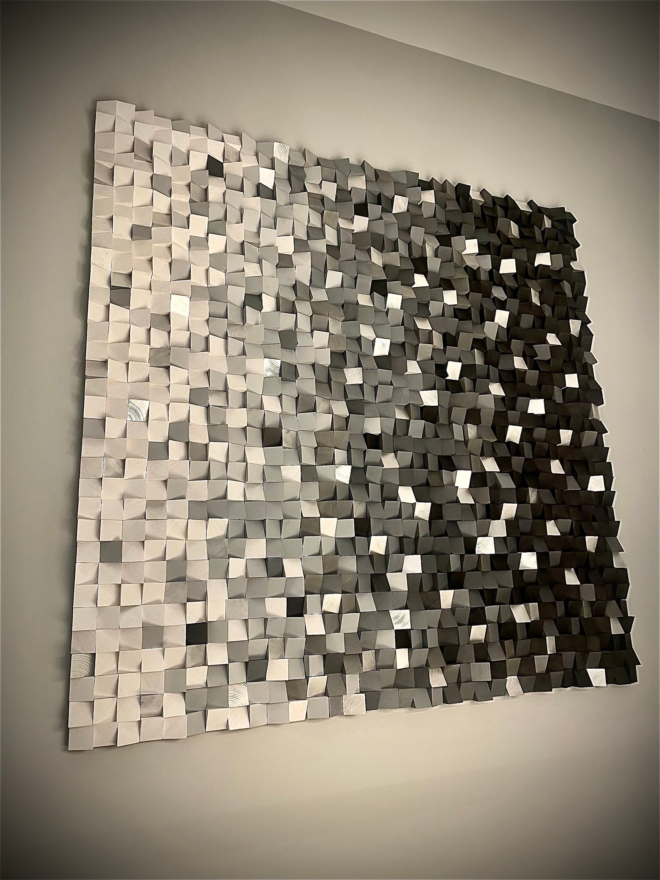 The panel will consist of 33 pieces by 33 wooden blocks up to 1" tall/deep, arranged in 5 rows of colors mixed in the way shown in the picture with metallic blue. According to your preferences, it will start from dark (anthracite/almost black) and gradually transition through lighter shades of warm gray to white, as shown in the sample blocks. Both photos contain the same colors, but they were taken from different angles and with different lighting.