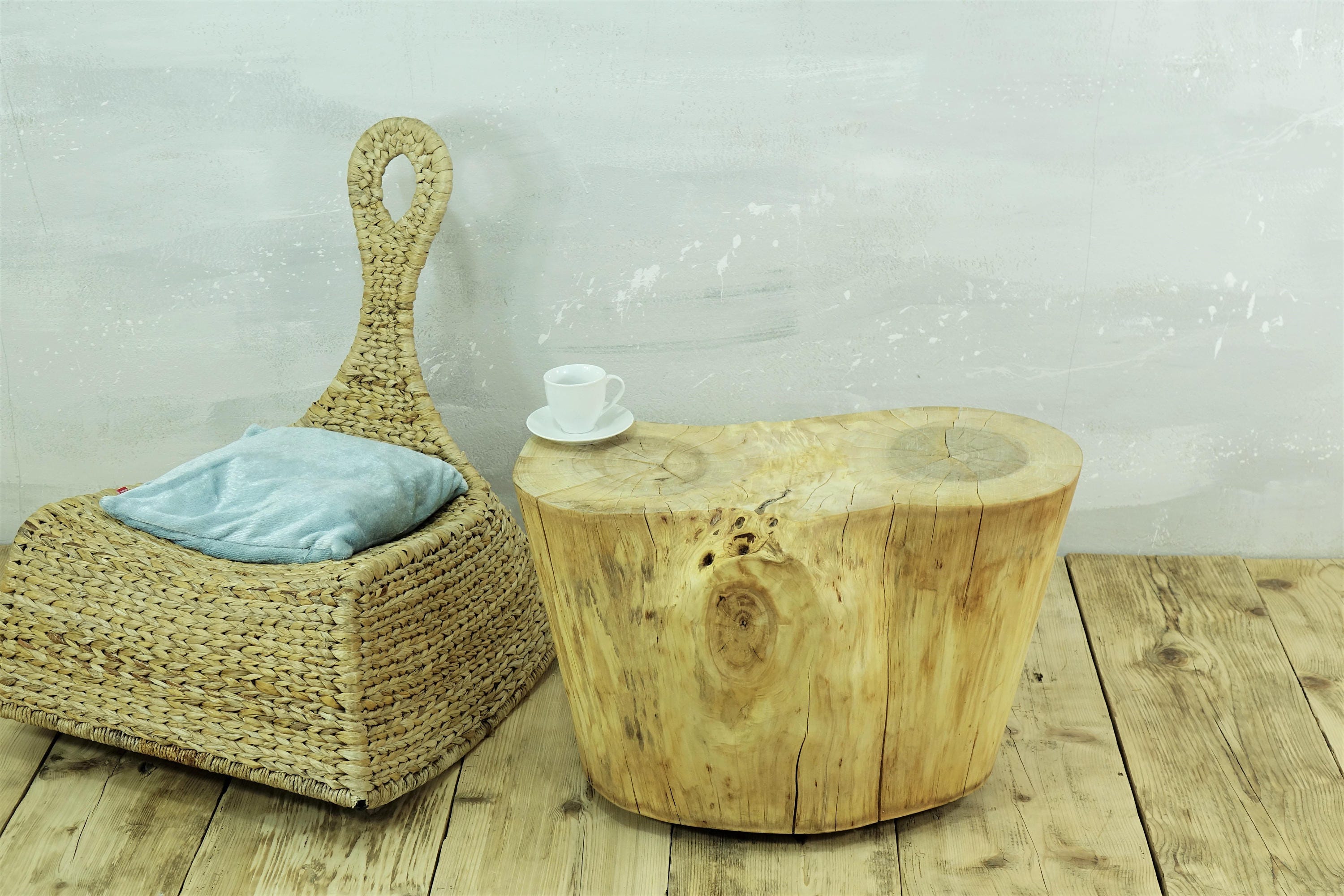This rustic tree trunk table is an excellent choice if you are looking for an original tree stump side table. It is wide enough to host at least two coffee cups and a bowl of your favourite cookies.