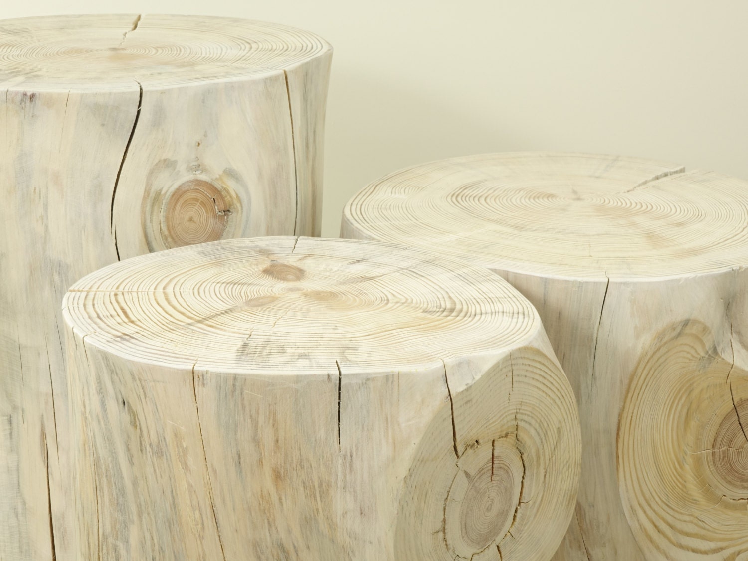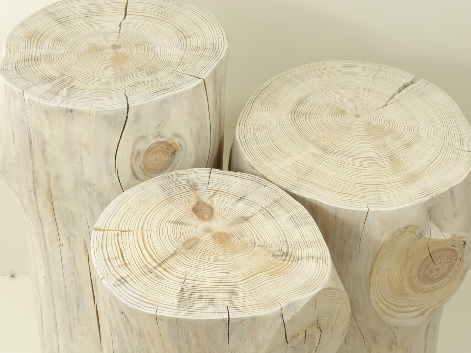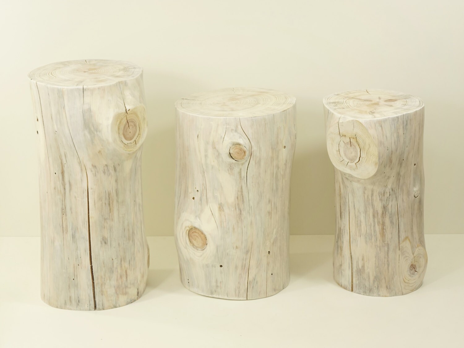 A set of 3 wooden stumps with a smoothed and polished top. The light white washed top and sides are treated with organic oil to remain this tree trunk fully natural. Stumps are kiln-dried - they free of any insects, mold or fungus.